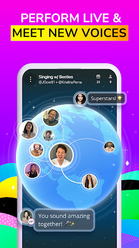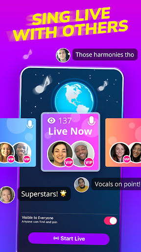 - Live Global Performances: Host or join live karaoke parties with the Sing Live feature—available 24/7. Perform in real-time with friends and music fans worldwide, receive live feedback, and build your fanbase as you share your talent on an interactive stage.